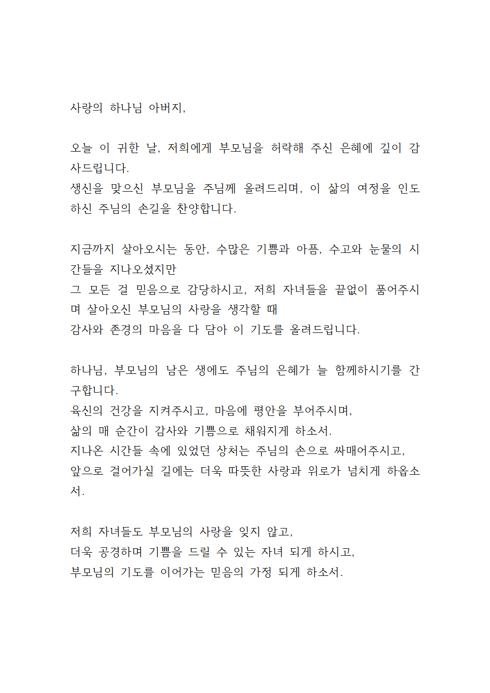 오늘 이 귀한 날, 저희에게 부모님을 허락해 주신 은혜에 깊이 감사드립니다.