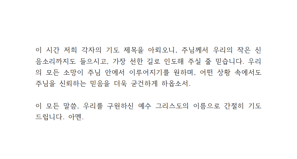 이 시간 저희 각자의 기도 제목을 아뢰오니, 주님께서 우리의 작은 신음소리까지도 들으시고, 가장 선한 길로 인도해 주실 줄 믿습니다. 우리의 모든 소망이 주님 안에서 이루어지기를 원하며, 어떤 상황 속에서도 주님을 신뢰하는 믿음을 더욱 굳건하게 하옵소서.
