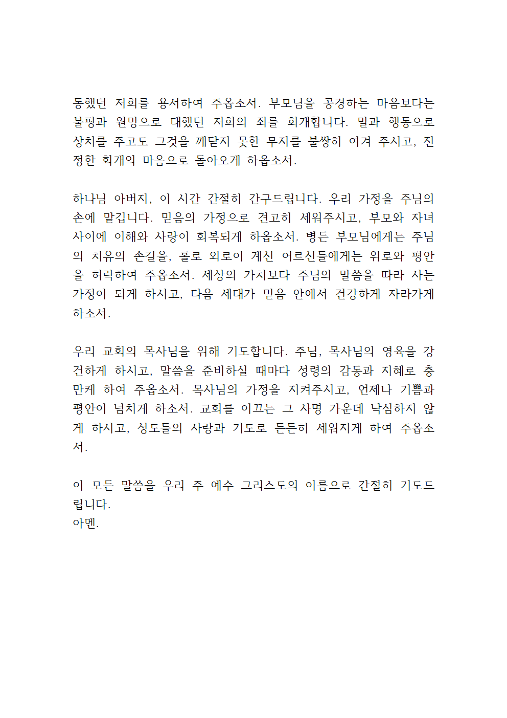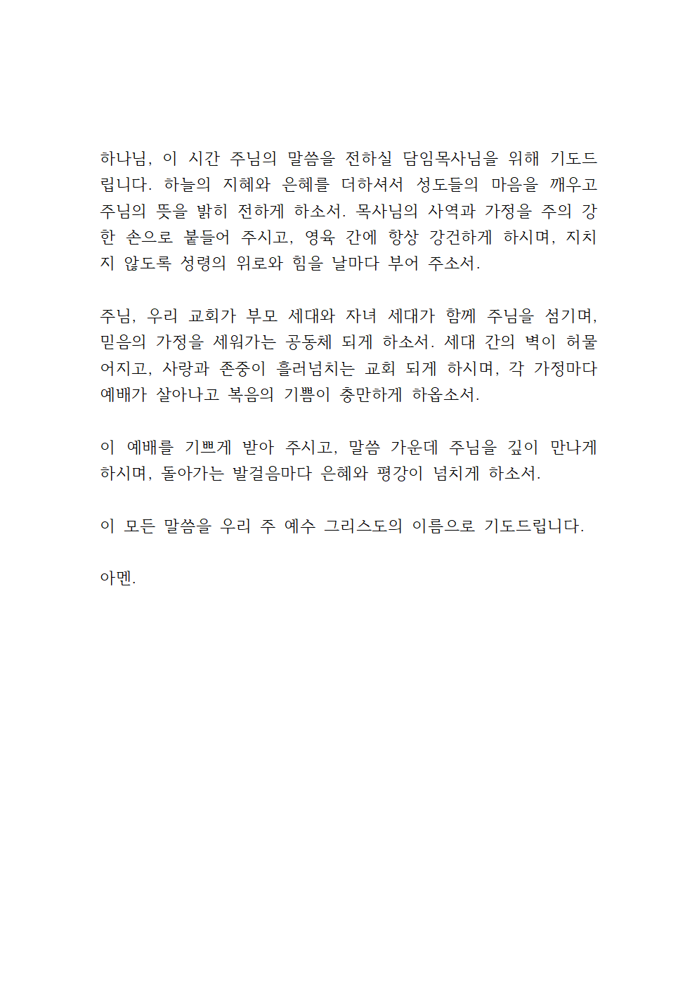 또한 이 땅의 모든 가정들을 위해 기도합니다. 가정마다 주님의 사랑이 중심이 되게 하시고, 부모와 자녀가 서로를 존중하며 이해하고 사랑하는 은혜가 넘치게 하옵소서. 가정이 깨어지고 상처받는 일들이 많은 시대 속에서, 우리 교회 가정들은 주님 안에서 더욱 굳건히 세워지는 복을 누리게 하옵소서.