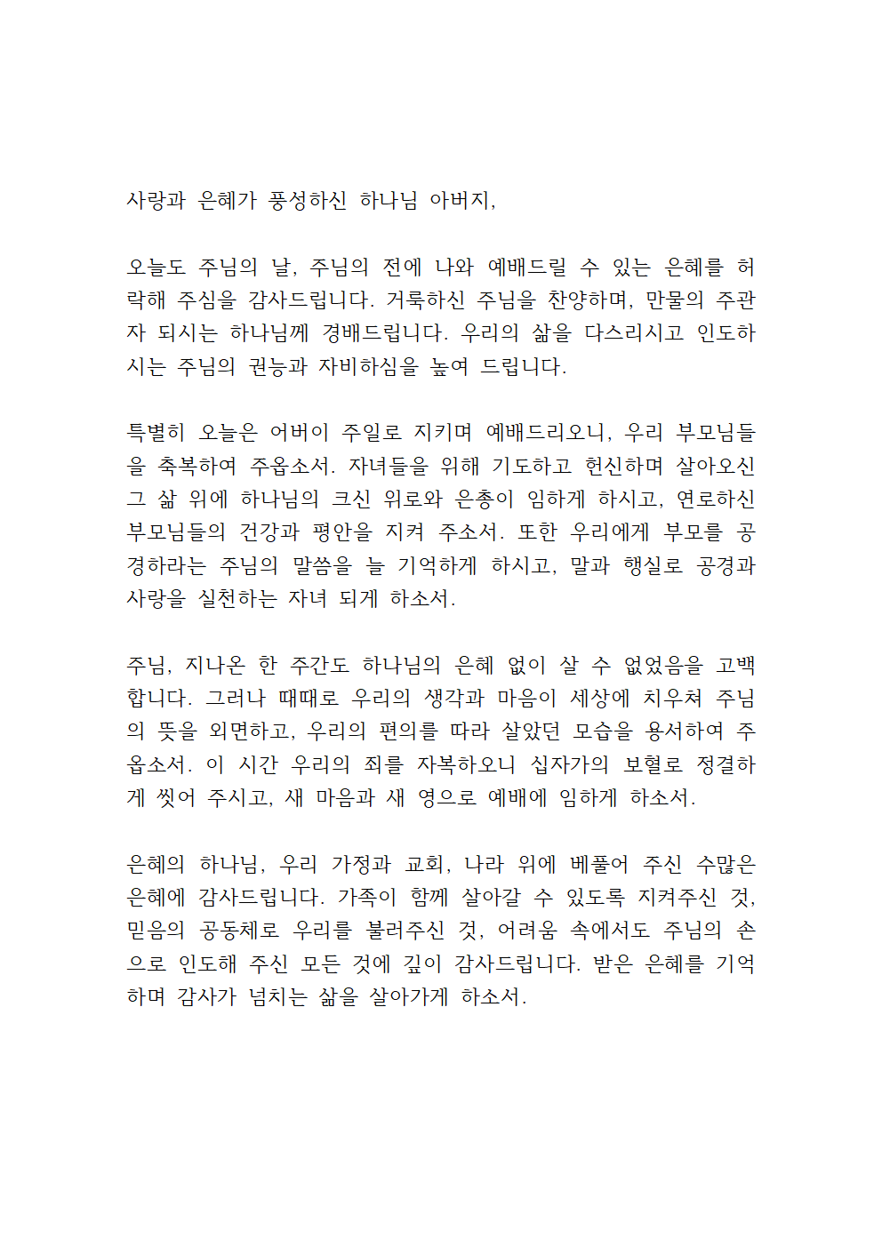 하나님 아버지, 이 세상의 모든 부모님들을 주님의 이름으로 축복합니다. 기쁨과 슬픔, 고단함과 희생 속에서도 자녀들을 위해 자신을 아낌없이 내어주신 부모님들의 사랑이 곧 하나님의 사랑을 닮은 것임을 고백합니다. 때로는 알아채지 못하고 지나친 부모님의 수고와 눈물과 기도를 이 시간 되새기게 하시고, 그 크신 사랑에 진심으로 감사하는 마음을 갖게 하여 주옵소서.