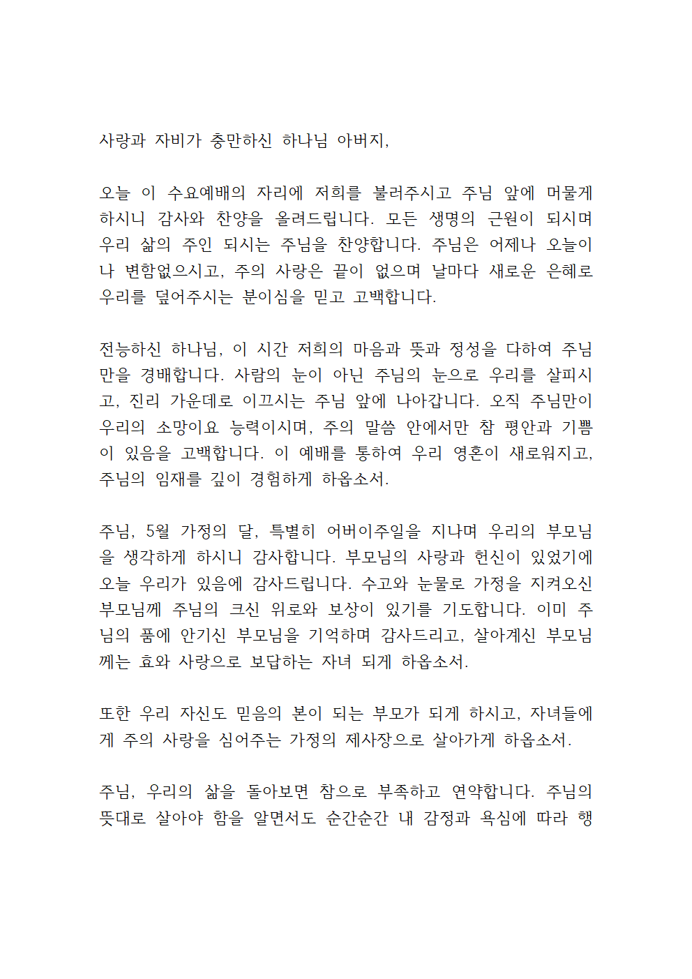 5월 둘째 주 수요일 대표기도문