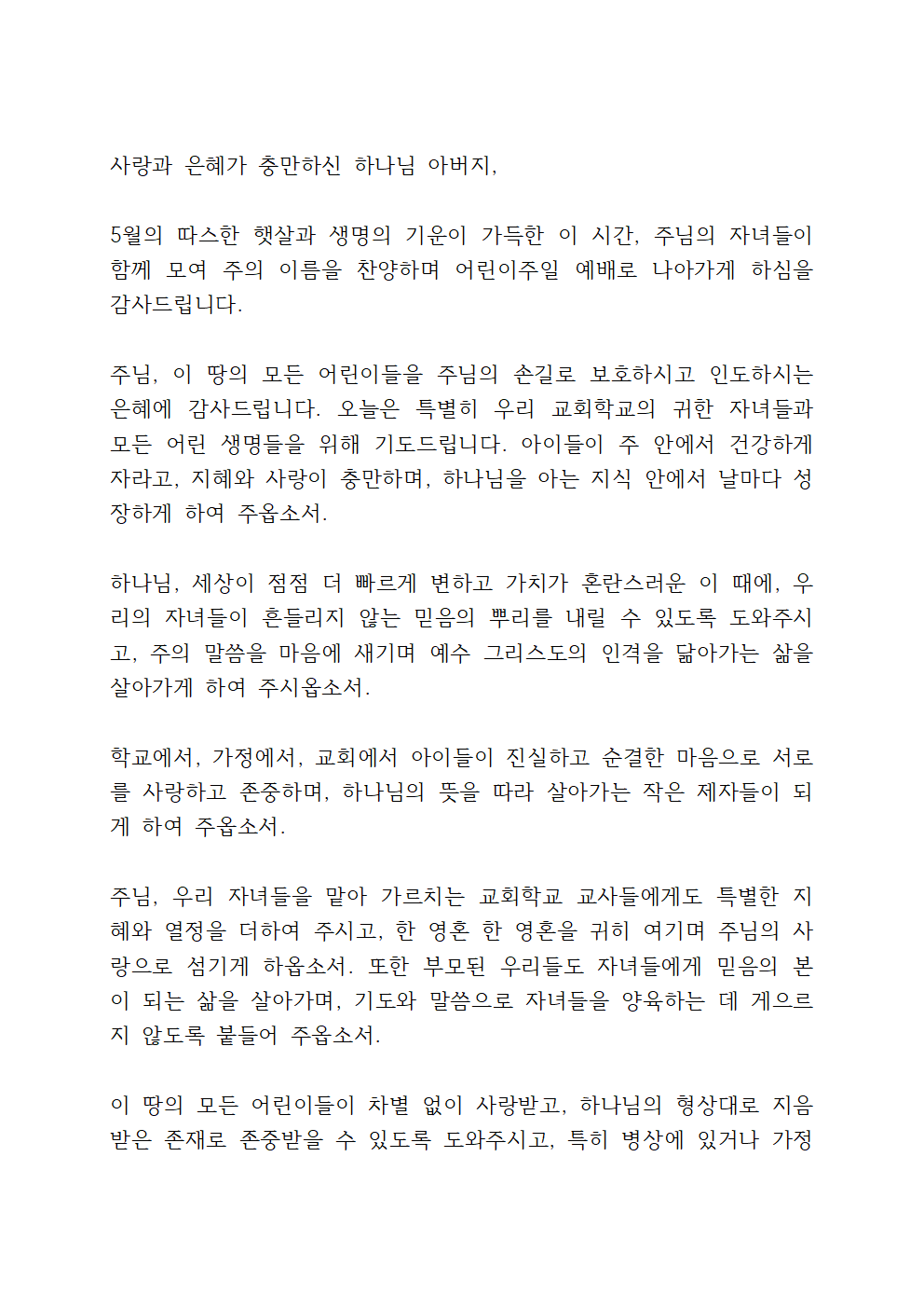 2025년 5월 첫째 주일예배 대표기도문 (어린이 주일)