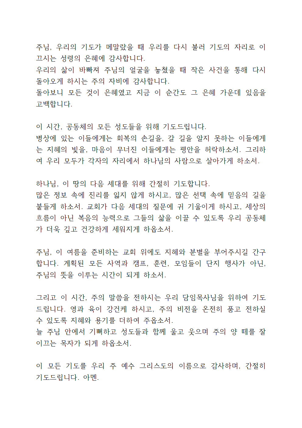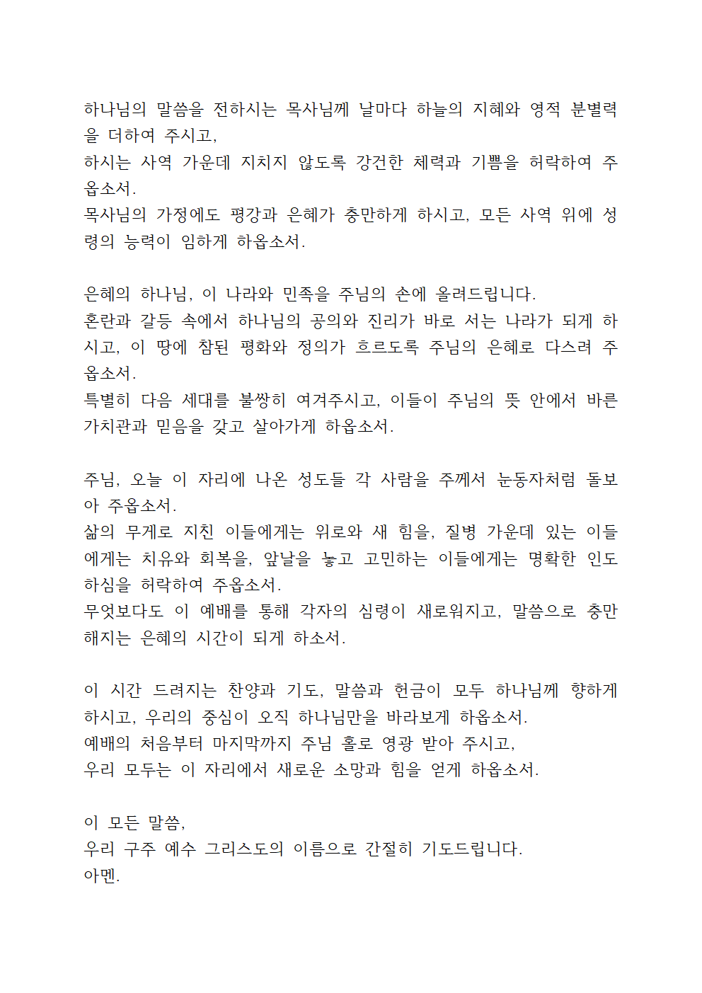 오늘 이 시간, 주님 한 분만이 영광 받으시기를 소망하며, 우리 주 예수 그리스도의 이름으로 간절히 기도드립니다.