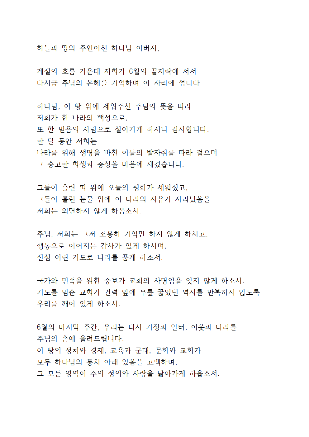 호국의 달 6월 마지막 주일에서 기도할 때는 주님께 이 땅의 평화와 회복을 위해 간구하고, 교회 공동체를 위해 기도하면 참 좋을 것입니다.