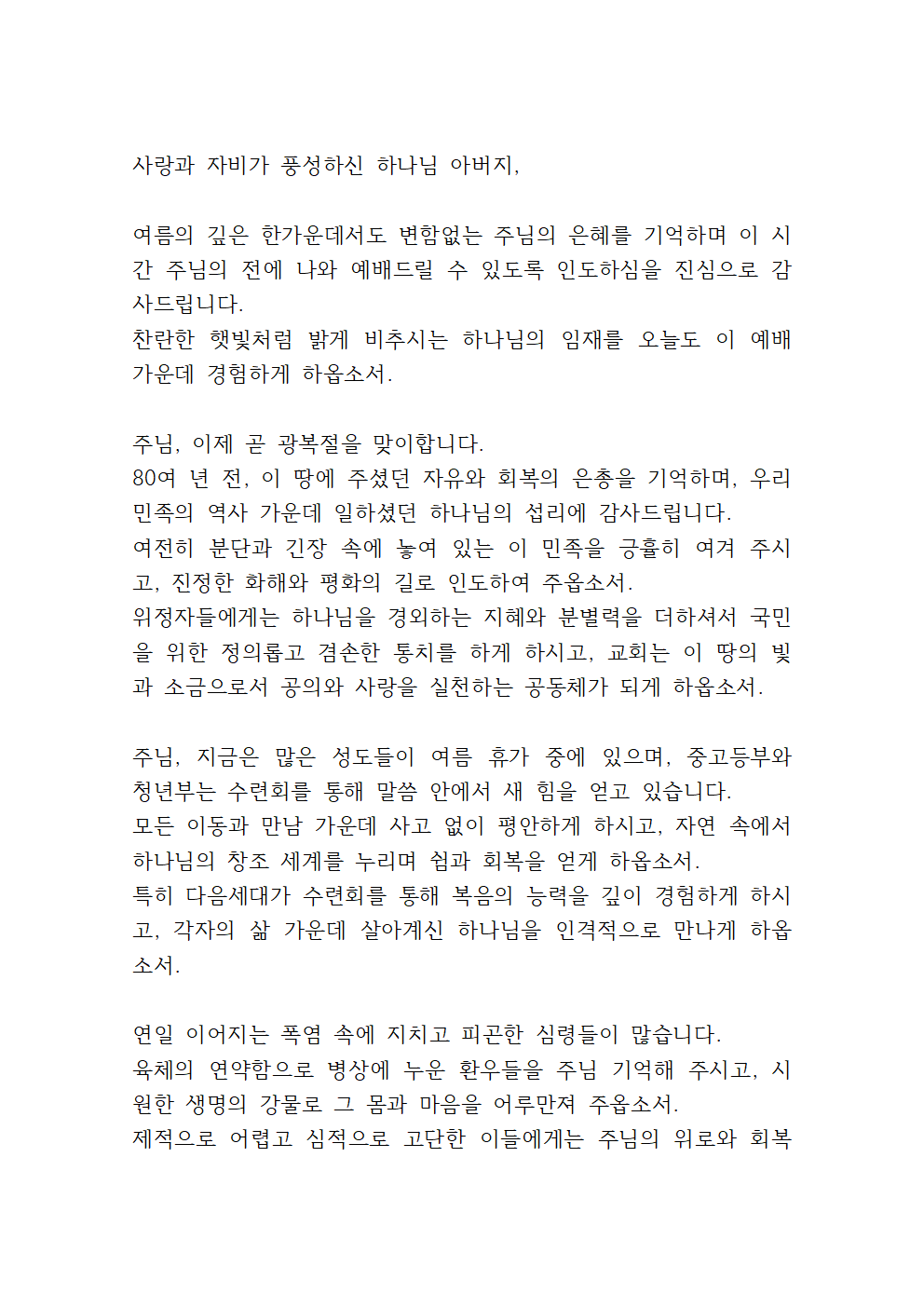 8월 둘째주일 낮예배 대표기도문 (2)