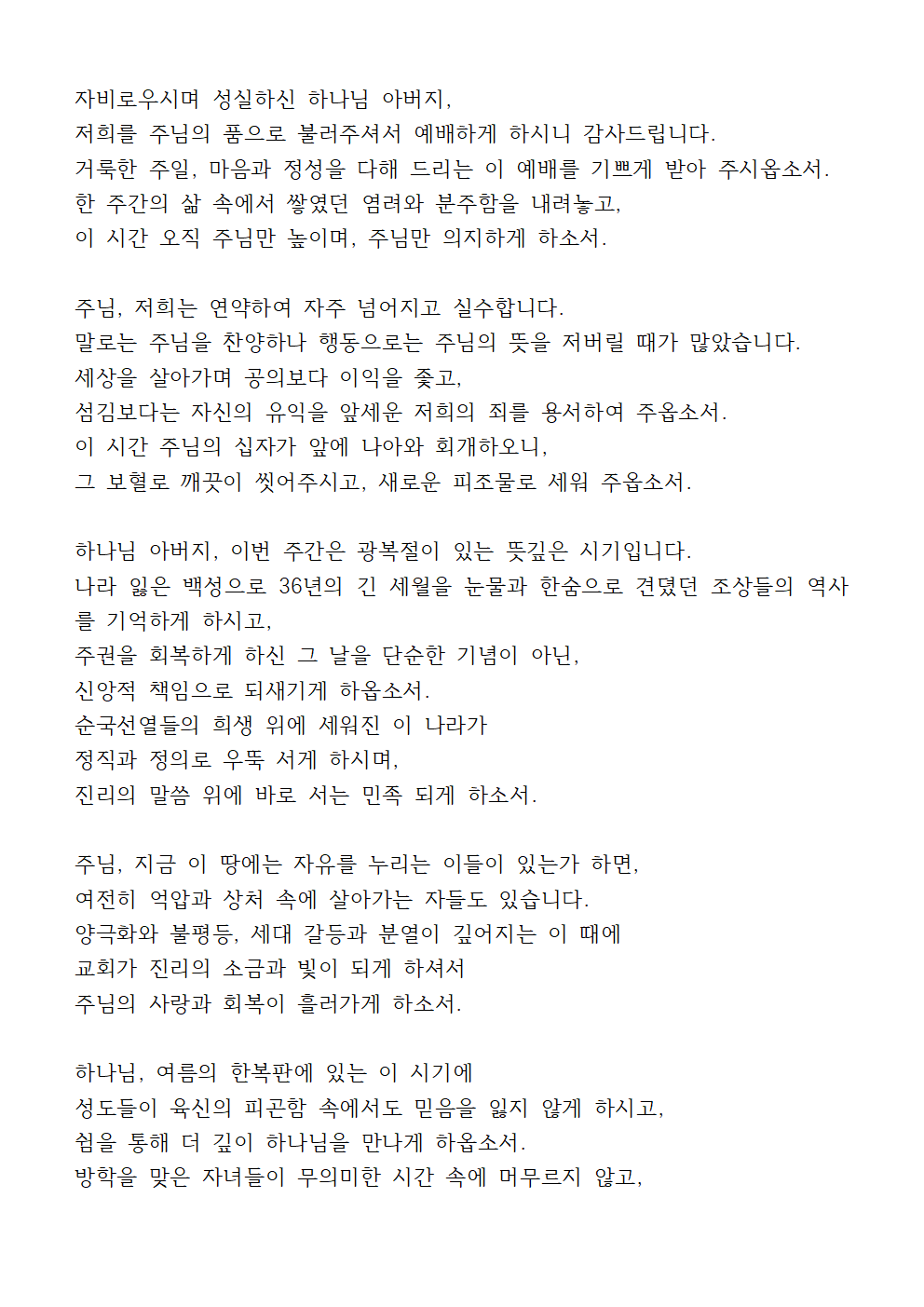 그리고, 광복의 은혜가 단지 과거의 사건이 아닌, 오늘 우리의 신앙과 책임으로 이어지면 좋겠습니다.