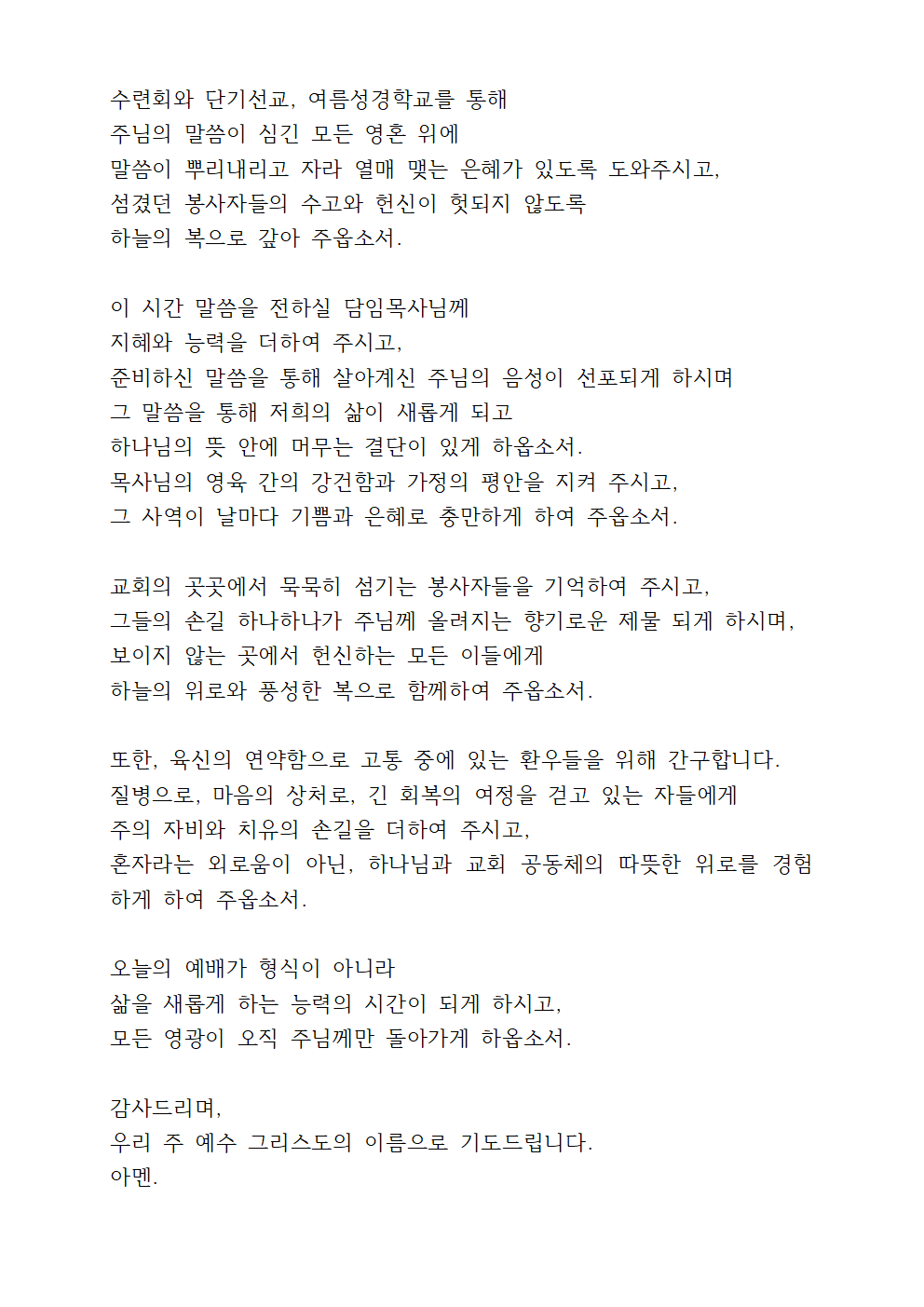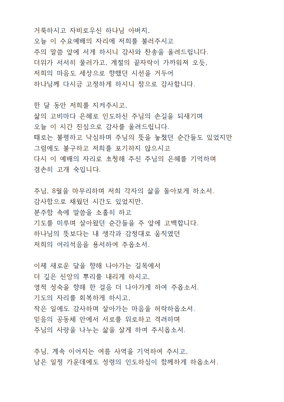 이번 글에서는 8월 수요예배 대표기도문 (넷째 주)을 안내해 드리겠습니다.