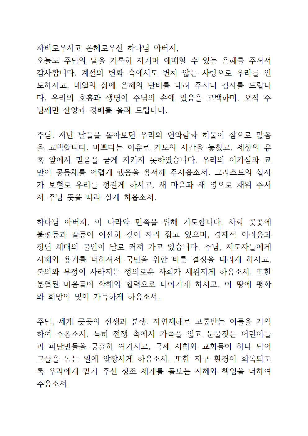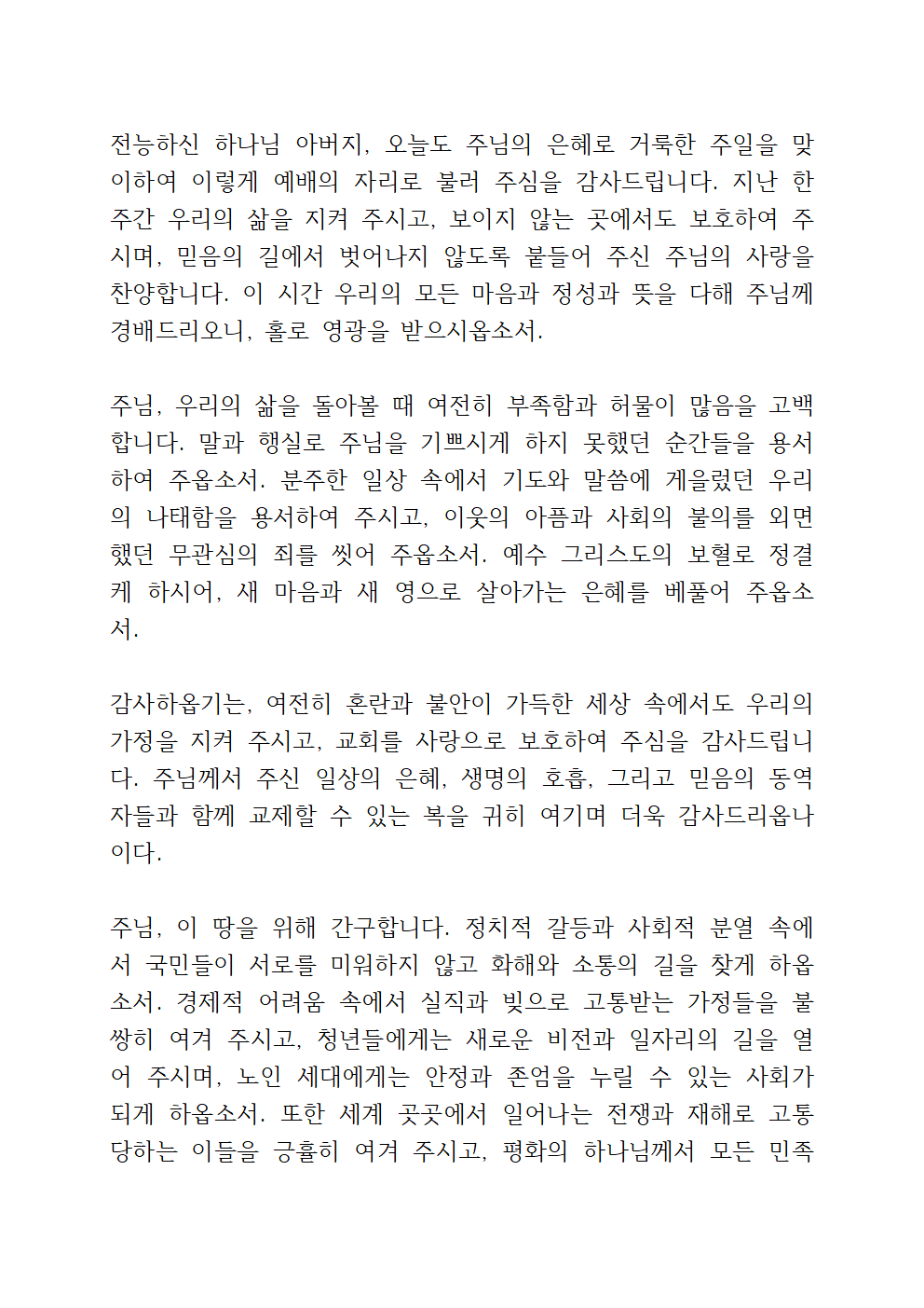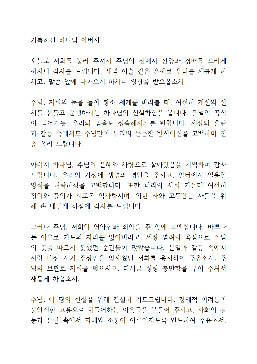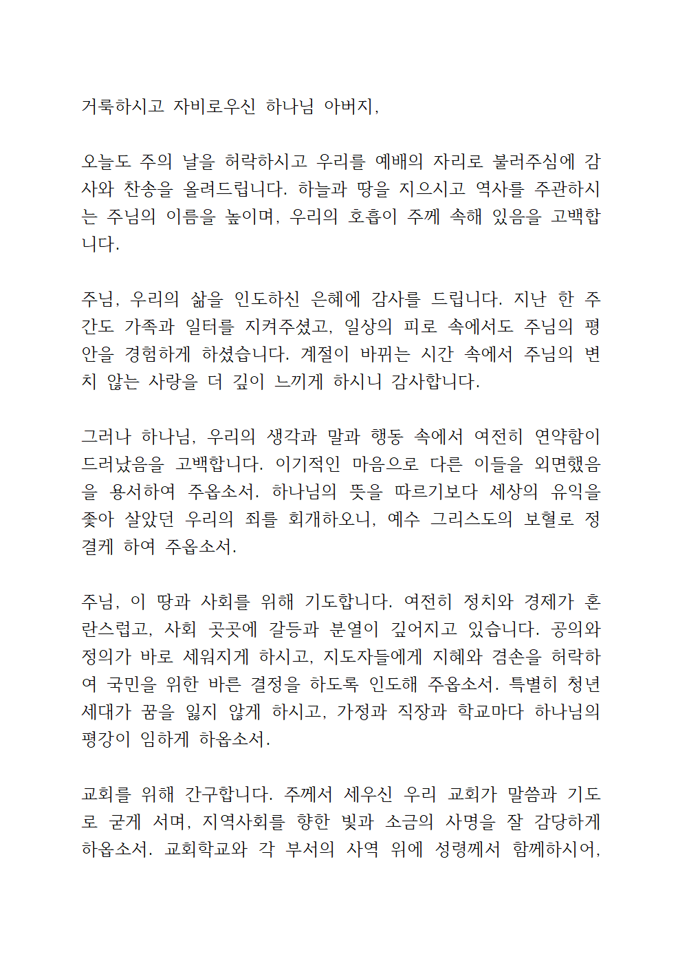 이번 주일 기도는 우리의 삶 속에서 여전히 살아 역사하시는 하나님의 손길을 더 깊이 느끼면 좋겠습니다. 세상의 불안과 갈등을 바라보며 낙심하기보다, 오히려 하나님의 평강이 가정과 사회와 나라에 임하기를 소망하면 좋을 듯합니다. 또한 우리의 연약함을 인정하고 주님의 은혜를 더욱 의지해 보세요.