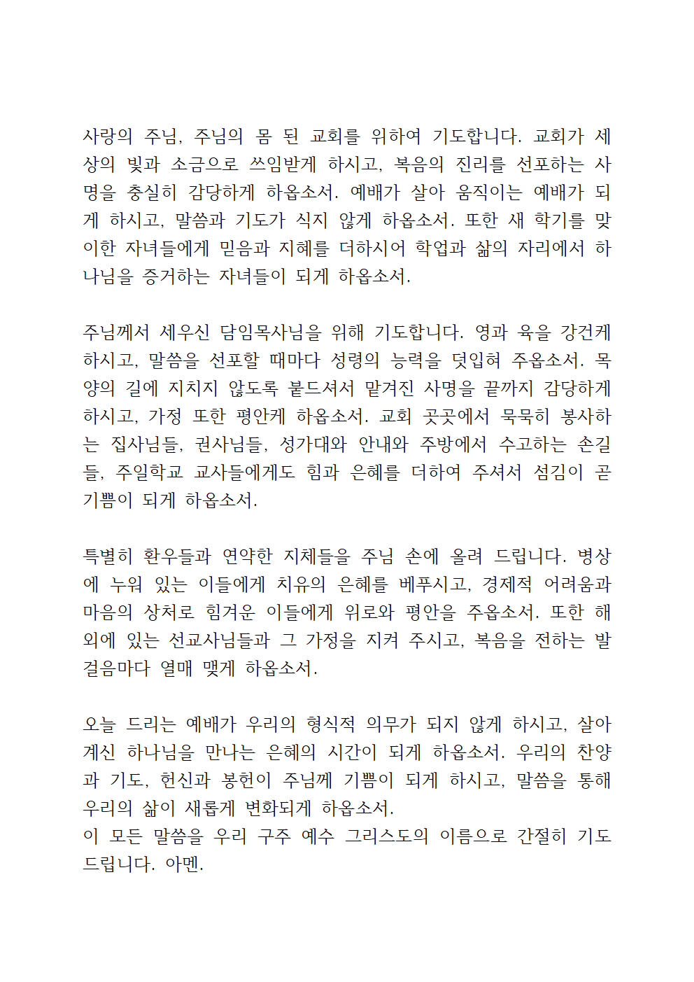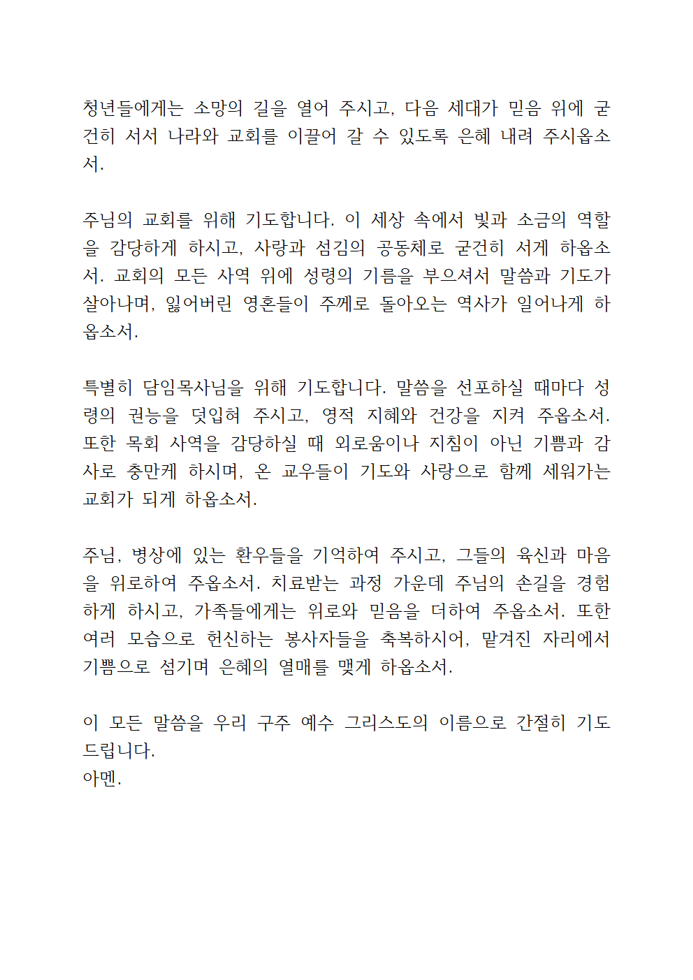 주님, 교회를 위하여 기도합니다. 세상 속에서 복음의 빛을 비추는 사명을 잃지 않게 하시고, 말씀과 기도로 든든히 세워지게 하옵소서. 세속의 가치가 아니라 하나님의 나라를 우선하는 믿음을 허락하시며, 다음 세대들이 믿음 안에서 자라 하나님을 기쁘시게 하는 일꾼들로 준비되게 하옵소서.